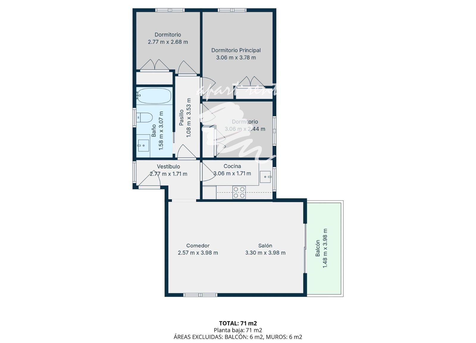 The apartment consists of 3 bedrooms, a full bathroom, a functional kitchen and a bright living room with access to a pleasant outdoor area. It features air conditioning with a heat pump.